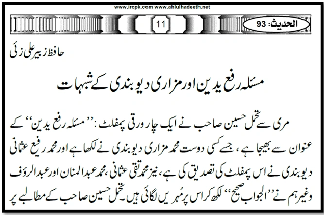 حضرت مولانا مفتی محمد تقی عثمانی حفظہ اللہ نے ترک رفع یدین کے دلائل پر مشتمل ایک تحریر کی تصدیق کرتے ہوئے” الجواب صحیح“ لکھاہے۔ ان دلائل میں یہی حدیث جابر بن سمرہ رضی اللہ عنہ موجود ہے۔ انجینئر مرزا محمد علی صاحب جن کو اپنا استاذ مانتے ہیں وہی زبیر علی زئی صاحب اپنے رسالہ ”الحدیث“ میں ان الفاظ میں اس حقیقت کا اقرار کرتے ہیں: